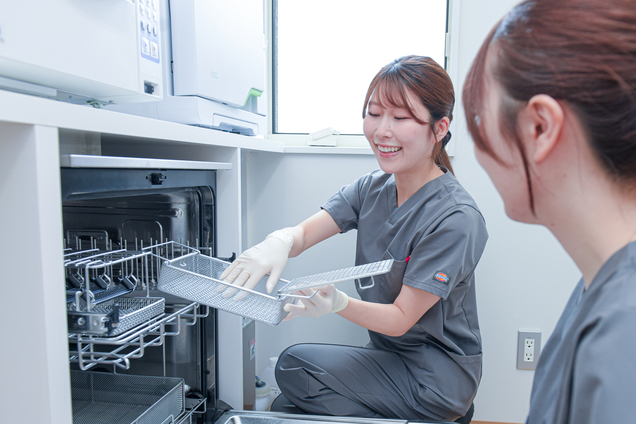 歯科治療で使用した器具の洗浄や、滅菌・消毒を行っていただきます。また、院内の掃除や診療後の片付け、朝の準備もお願いします。手袋は使い捨て、感染防御には細心の配慮をしていますので、安心して働けます。