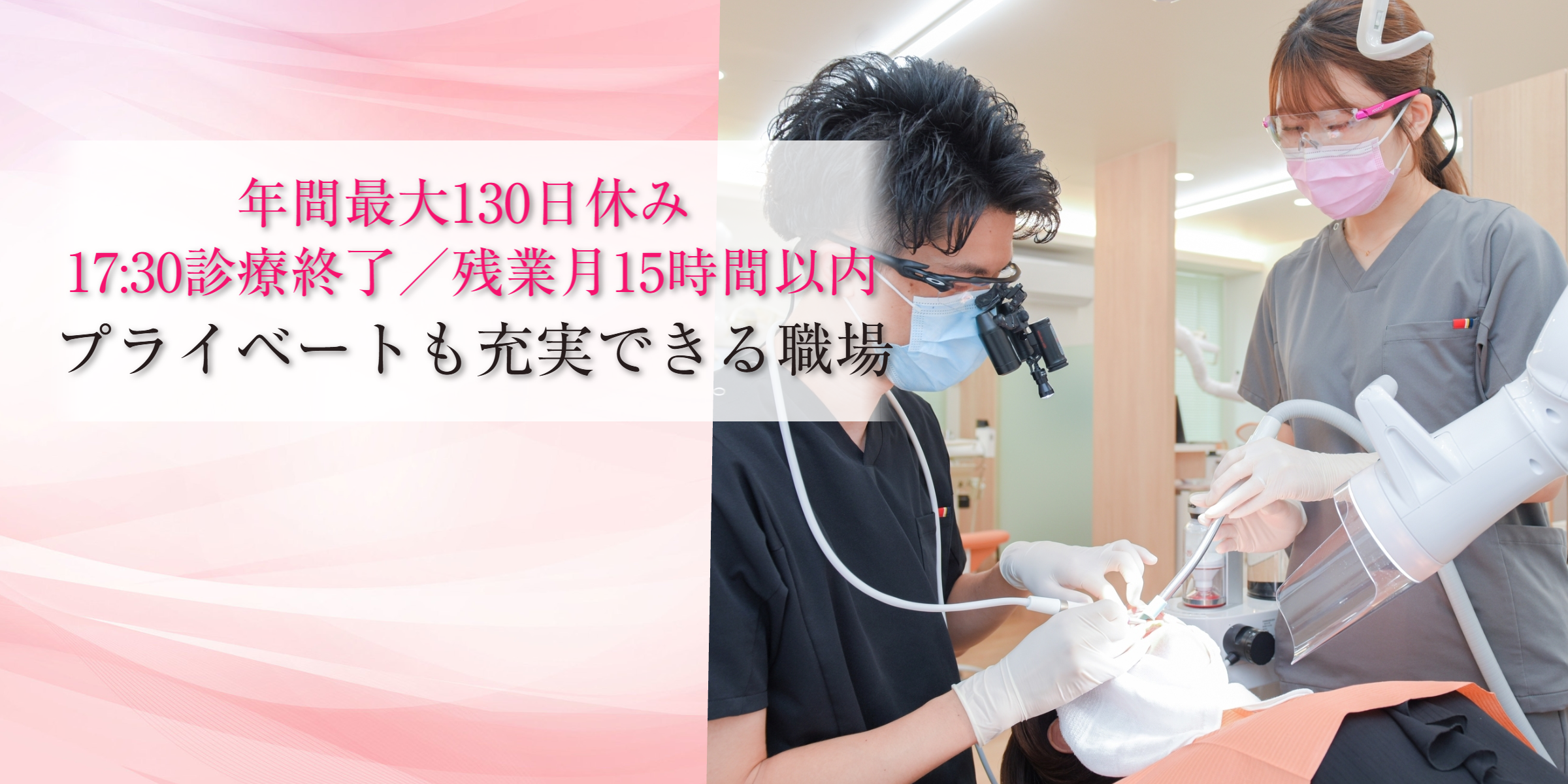 クリーニングや歯磨き指導のほか、歯科衛生士本来の仕事で活躍できます。残業が少なく18:00には退勤可能。教育体制も整っています。